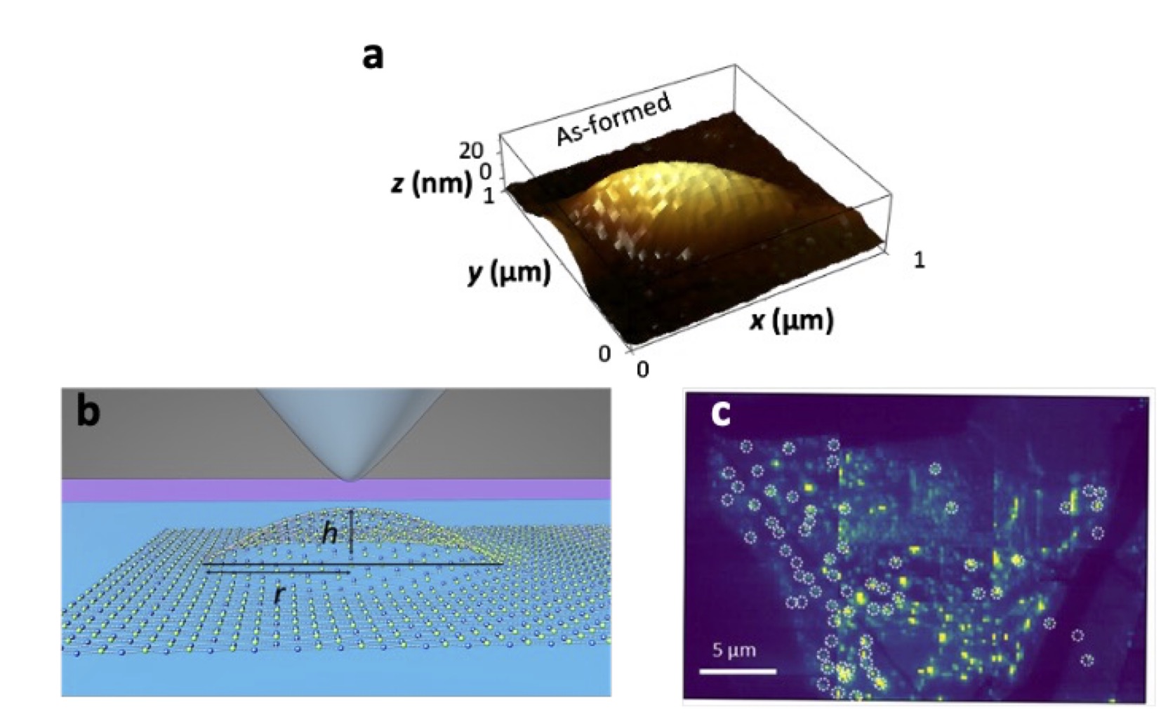 The bubbles form spontaneously, like trapped air pockets under stretched film, as uneven contact during the stacking of ultrathin WSe2 sheets on smooth surfaces causes bubble-like distortions, and are typically unwanted—often regarded as defects. “Nanobubbles first appeared during sample preparation and were randomly found in the sample. So at the beginning, we did not plan to study nanobubbles at all,” Zhou reports. A review of the literature pointed to earlier work by Thomas Darlington, a Scientific Engineering Associate in the Imaging Facility, who found that the strain within the nanobubbles could alter their electronic and optical properties, even enabling single-photon emission.